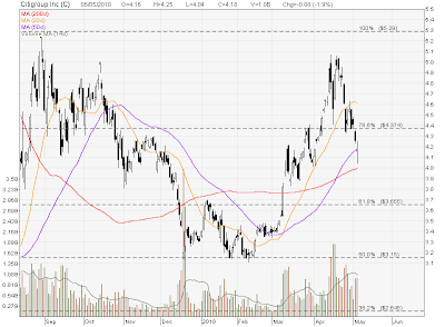 Citigroup has formed a wedge and currently very close to the wedge support near the 61.8% Fibonacci Retracement Level. Currently Citigroup just broke below all the three moving averages (20D, 50D, 200D) which is a bearish sign. Watch closely for the breakout. Base on the chart pattern, breakdown from this wedge pattern may send the stock to $1.00 but personally I think is unlikely to reach that level. I feel that the downside risk is limited and I am waiting Citigroup to go lower after breakout for long term investment.