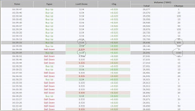 15 minutes later, the price moved up to $0.52 and I can see some genuine retail investors were buying up (100, 26, 92) and suddenly a 500 lots transaction shown up! Refer to Screen 4.